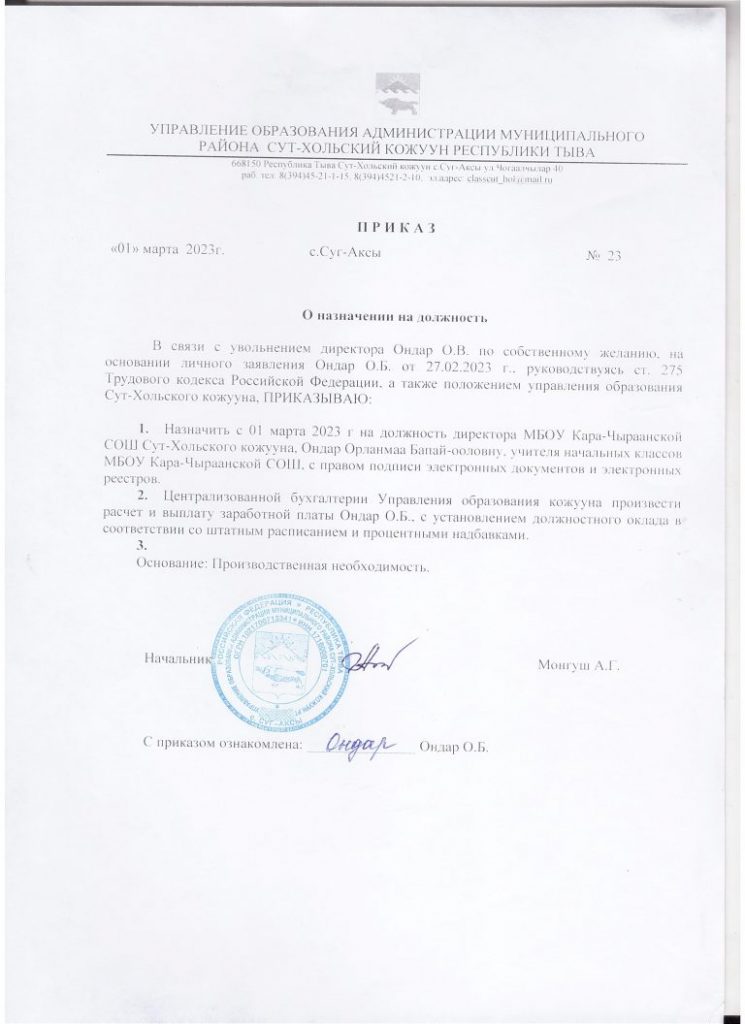 Руководитель МБОУ Кара-Чыраанской СОШ Сут-Хольского кожууна Республики Тыва: